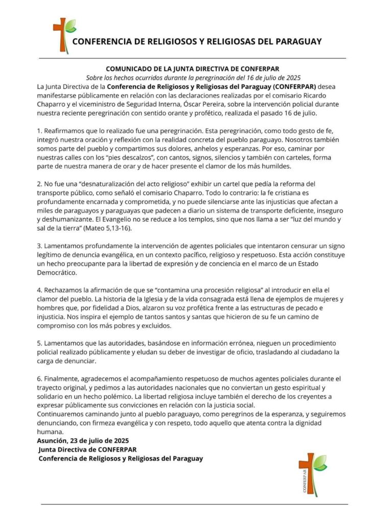 La Conferencia de Religiosos y Religiosas del Paraguay (CONFERPAR) se pronuncia tras la intervención policial en peregrinación del 16 de julio de 2025.